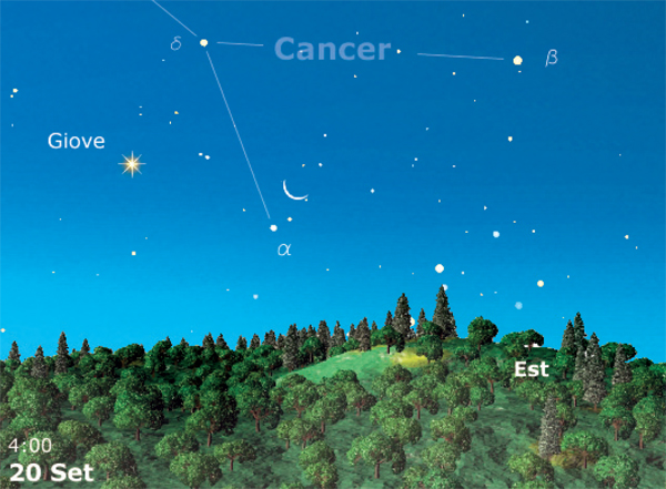 Verso le quattro del mattino del 20 settembre, si potrà assistere sull’orizzonte est al sorgere della Luna, ridotta a una falce sottile, accompagnata da Giove, circa 6° a est. I due oggetti saranno visibili nel Cancro e a quell’ora saranno alti circa +7°. Potranno essere seguiti per almeno altre tre ore finché non saranno molto più alti, ma ovviamente il miglior effetto in una ripresa panoramica si otterrà quando saranno vicini all’orizzonte.