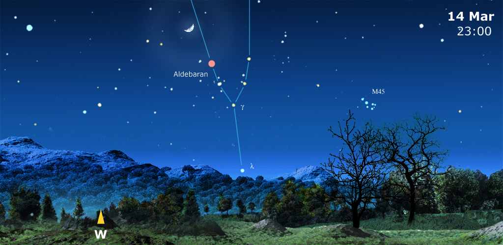 Verso le 19:15 di sera, una sottile falce di Luna crescente sarà nell’ammasso delle Iadi, circa 2° a est di Aldebaran (mag. +0,9)