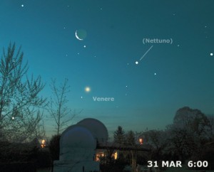 Ultimo appuntamento del mese quello del 31 marzo, quando sempre all’alba (purtroppo!), verso le 5:30, una esilissima falce lunare precederà di pochi minuti il sorgere di Venere, con Nettuno a disposizione di chi volesse tentarne il difficilissimo ritrovamento.