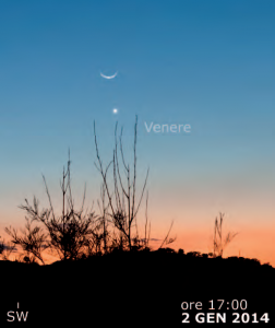 Il 2014 si aprirà con una congiunzione tra Venere è una esilissima falce di Lunacrescente, osservabile verso le 17:00 del 2 gennaio sull’orizzonte di sudovest. I due oggetti a quell’ora, con il Sole appena tramontato, saranno alti circa +11° e disteranno l’uno dall’altro 2,8°.