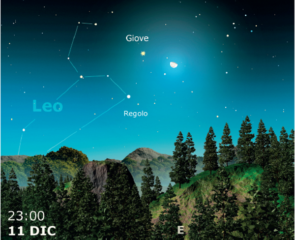 Dopo quella del 15 novembre scorso, larga 7°, un’altra discreta congiunzione tra Luna e Giove (questa volta un po’ più stretta) avrà luogo la sera dell’11 dicembre. I due oggetti sorgeranno dall’orizzonte est separati di circa 5°, mostrandosi proprio davanti alla testa del Leone e a Regolo. Peccato per la fase ancora un po’ abbondante del nostro satellite, decisamente invasiva con il suo chiarore.