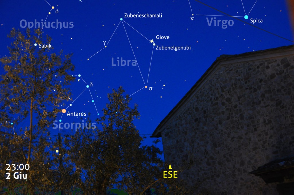 Parliamo della stella Alfa Librae (Zubenelgenubi; mag. +2,7): alle ore 23:00 del 2 giugno, il grande e brillante pianeta si troverà a circa 53’ a nordest della stella. D’ora in avanti, compiuto il sorpasso, vedremo il pianeta allontanarsi progressivamente da essa.