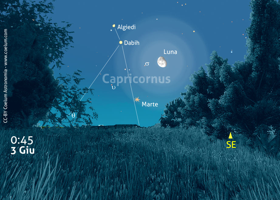 Dopo dopo la mezzanotte, ormai al 3 giugno, guardando a est-sudest, potremo invece vedere sorgere la Luna (fase 82%) seguita, una mezz’ora più tardi, dal pianeta Marte che ci apparirà come una stellina rossastra e brillante (mag. –1,3).