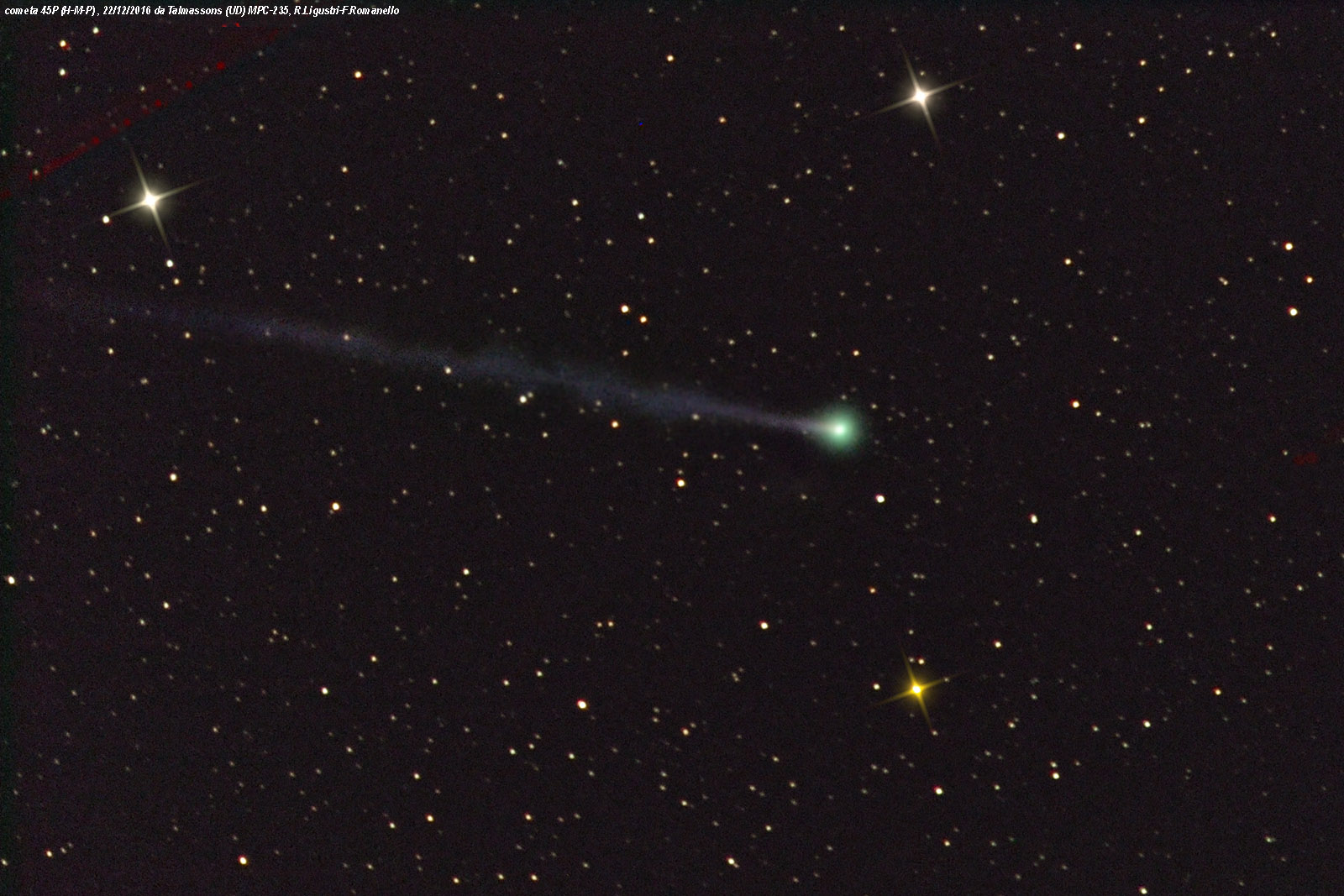 Cominciamo con la 45P/Honda- Mrkos-Pajdusakova, che a fine dicembre è passata al perielio ed è stata valutata attorno alla settima magnitudine. In seguito è scomparsa alla nostra vista, fagocitata dalla luce solare che ha nascosto il suo avvicinamento al nostro pianeta. La ritroveremo però al termine della notte astronomica nei primissimi giorni di febbraio, bassissima sull’orizzonte orientale. Il suo notevole moto da est verso nord ovest le permetterà ben presto di alzarsi in cielo, fino a culminare poco dopo mezzanotte a fine mese. L’11 febbraio passerà a 0,084 UA dal nostro pianeta, toccando la distanza minima. In quell’istante dovrebbe aver raggiunto il massimo splendore di questa apparizione (si prevede che possa raggiungere la sesta magnitudine). [continua a leggere]