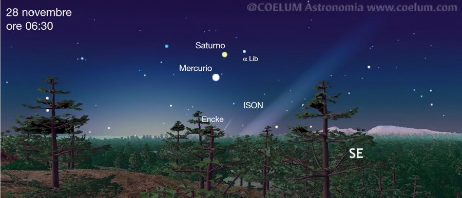 Quello che si potrà eventualmente osservare la mattina del 28 novembre è mostrato nell’illustrazione qui in alto, che raffigura l’orizzonte est alle 6:30 del mattino, quando il Sole e la testa della cometa saranno ancora depressi di circa –7°. Se avesse tenuto fede alle previsioni, della ISON si sarebbe comunque potuta vedere solo la parte terminale della coda, cosa che non è detto che non possa ancora accadere.