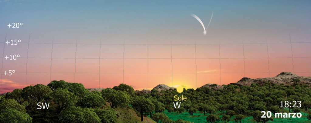 La figura illustra la posizione della cometa al momento del tramonto del Sole (situato in corrispondenza del dischetto giallo, non in scala), con il cielo quindi ancora quasi chiaro.