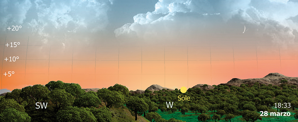La figura illustra la posizione della cometa al momento del tramonto del Sole (situato in corrispondenza del dischetto giallo, non in scala), con il cielo quindi ancora quasi chiaro.