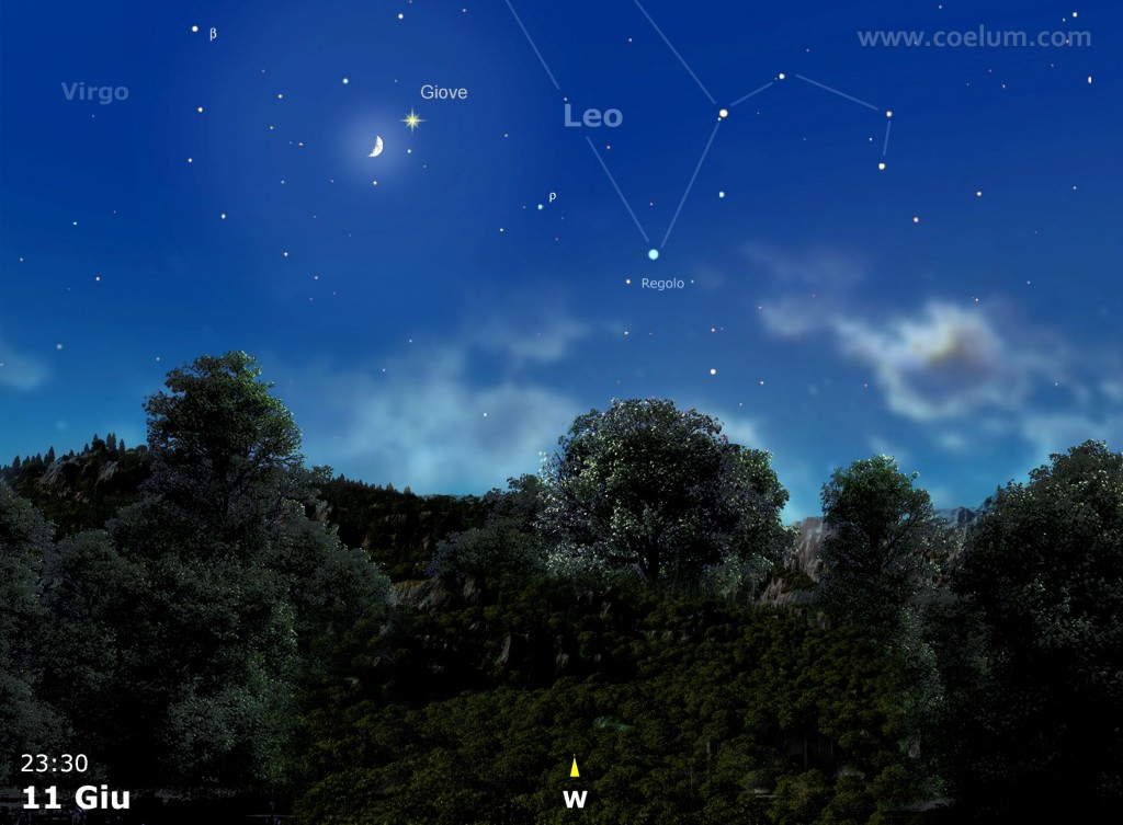 Per assistere dall’Italia a un’occultazione di Giove da parte della Luna (che manca dal luglio 2012) si dovrà probabilmente aspettare il 28 novembre 2019, e nel frattempo ci si dovrà accontentare di congiunzioni più o meno strette; come ad esempio quella che si verificherà la sera dell’11 giugno alle 23:30 quando un robusto crescente di Luna avvicinerà il pianeta fino a una distanza di 2,4°.