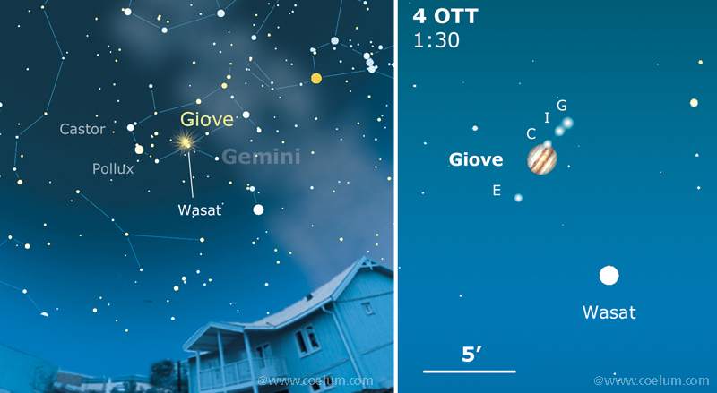 La mattina del 4 ottobre, poco dopo la mezzanotte, Giove (mag. –2,2) sorgerà dall’orizzonte est-nordest nascondendo nella sua areola luminosa un oggetto più debole, ovvero la stella Wasat o delta Geminorum (m = +3,5; famosa anche perché nei suoi pressi venne trovato Plutone nel 1930).