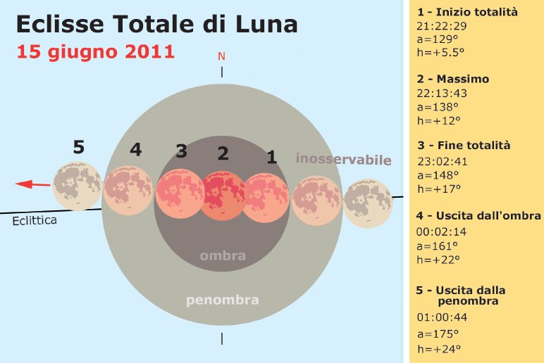 L’aspetto negativo sta nel fatto che la Luna sorgerà soltanto pochi minuti prima dell’inizio della totalità, per cui gli osservatori italiani perderanno le fasi dell’entrata nella penombra e della parzialità.