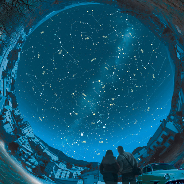 Per quanto riguarda l’aspetto del cielo, nella prima parte della notte predomineranno ancora le costellazioni invernali; verso le 20:30 saranno infatti in meridiano il Cane maggiore e Orione, con l’Auriga allo zenit. A ovest staranno invece già tramontando Pegaso e Balena, mentre a est il cielo sarà già occupato dagli asterismi primaverili tra cui – facilmente riconoscibili – il Leone e le prime propaggini della Vergine. Più tardi sorgerà anche la brillante Arturo nel Boote, mentre a ovest comincerà a essere evidente il declino di Orione verso l’orizzonte. Molto più in alto, quasi immobile a nord, il Grande Carro sembrerà in procinto di rovesciarsi. Giove nei Gemelli, e poi, più tardi, Marte nella Vergine, saranno i due pianeti osservabili con maggior facilità.