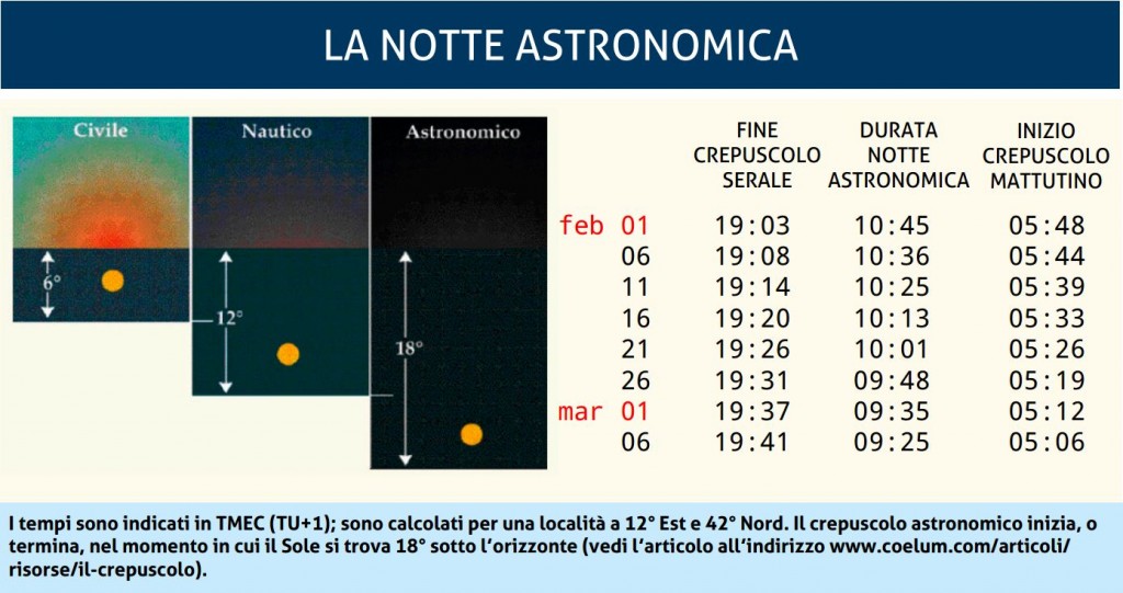 Il 16 febbraio il Sole si sposterà dal Capricorno all’Acquario (ovviamente stiamo parlando di costellazioni, non di “segni astrologici”), proseguendo nel contempo la “risalita” dell’eclittica a una velocità media in declinazione di circa 20′ al giorno. Partendo dai -17°,4 di inizio mese, supererà i -10° alla fine, e da questo ne deriverà un corrispondente aumento dell’altezza sull’orizzonte al momento del passaggio in meridiano. Aumenteranno così le ore di luce, tanto che la sera, in media, si potrà iniziare ad osservare con il massimo contrasto non prima delle 19:15, fino alle :30 del mattino dopo. La durata della notte astronomica, in continua diminuzione, in febbraio sarà in sostanza di poco superiore alle 10 ore.