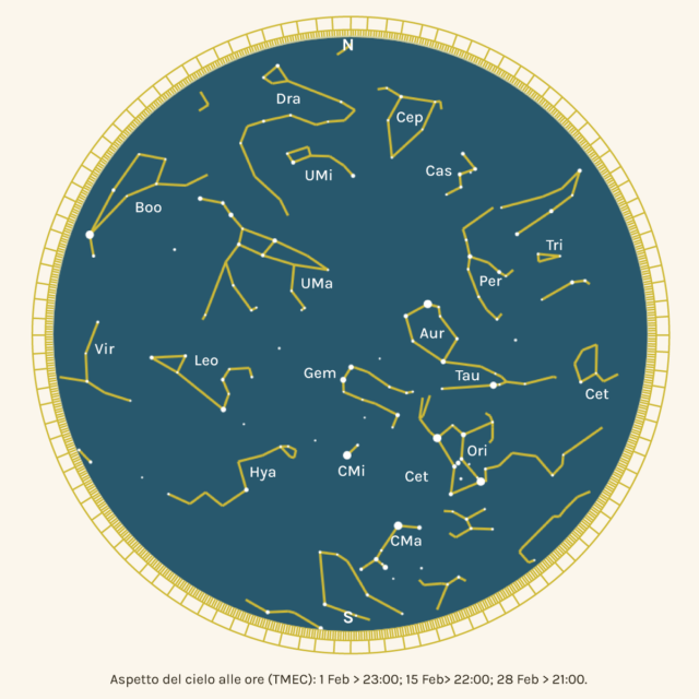 Il mese di febbraio ci offre ancora un’ampia panoramica sulle costellazioni invernali che occupano la volta celeste con i loro astri dominanti.