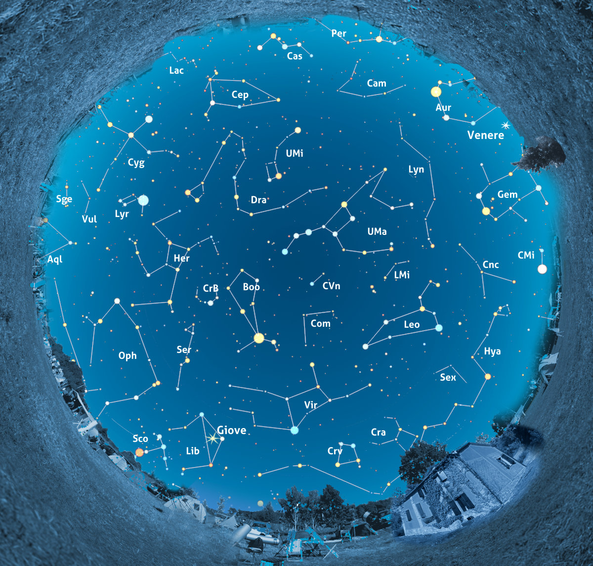Allo zenit, verso nord, volteggerà intanto l’inconfondibile sagoma del Grande Carro e sarà possibile ammirare per intero la grande costellazione dell’Orsa Maggiore. A sudest, nei pressi dell’orizzonte, si affaccerà la testa dello Scorpione, caratterizzata dalla rossa Antares, preceduta dalla Bilancia che ospita il brillante Giove, questo mese in opposizione. Più a est cominceranno a farsi notare le grandi costellazioni estive come il Cigno, la Lira, con la bella Vega, e l’Ercole.