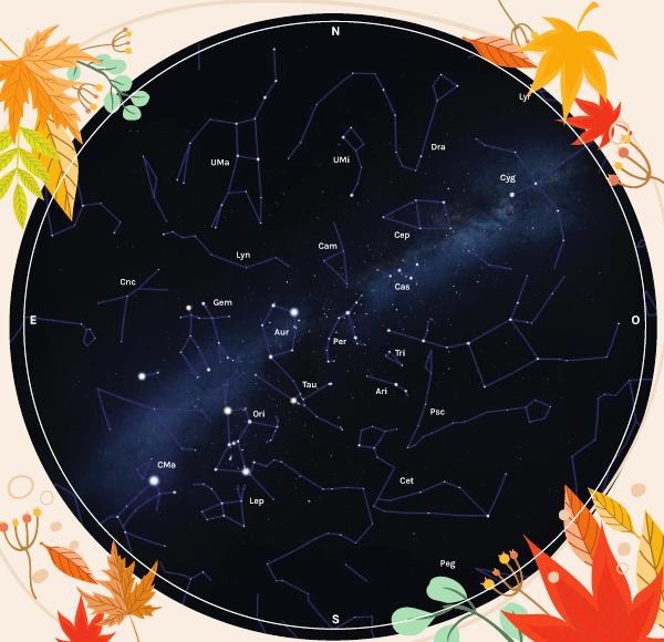 Verso la mezzanotte si avvicinerà al “mezzocielo superiore” (il punto in cui l’equatore celeste taglia il meridiano, che alle nostre latitudini è situato a circa 48° di altezza) l’inconfondibile Orione, accompagnato dal Toro, con la bella Aldebaran e le Pleiadi, Gemelli e Cane Maggiore con la lucente Sirio. Più in basso, il meridiano sarà attraversato dalla estesa ma debole costellazione dell’Eridano. Cigno e Pegaso si staranno dirigendo verso il tramonto sull’orizzonte ovest, mentre dalla parte opposta del cielo starà sorgendo il grande Leone, con Regolo.
