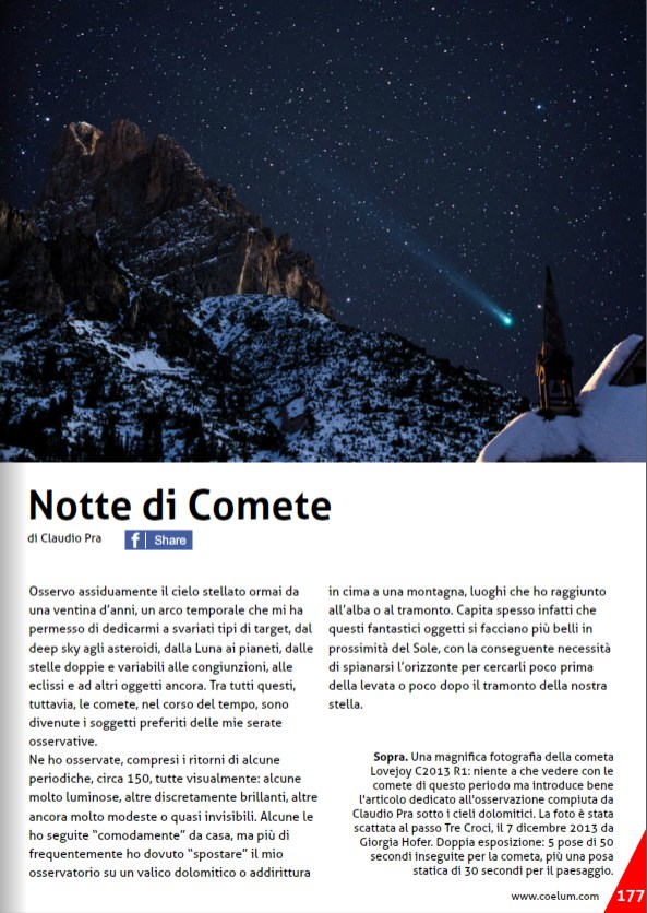 Su Coelum astronomia di aprile (ricordiamo che la lettura è in formato digitale e gratuito) la rubrica completa di Claudio Pra e questo mese un suo racconto dedicato all’osservazione delle quattro comete del periodo: Notte di comete. Corredato come sempre dalle magnifiche foto dei nostri lettori!