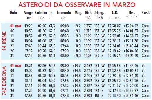Per tornare agli asteroidi “seri”, in marzo saranno sei gli oggetti in opposizione a scendere sotto la undicesima magnitudine; di questi, solo 3 – Eunomia, Amphitrite e Irene – scenderanno sotto la mag. +10, e solo uno – Irene – addirittura sotto la +9… Eh sì, perché il pianetino (14) Irene, come già vi avevo anticipato il mese scorso, in marzo si produrrà in un avvicinamento da record, impossibile da trascurare.
