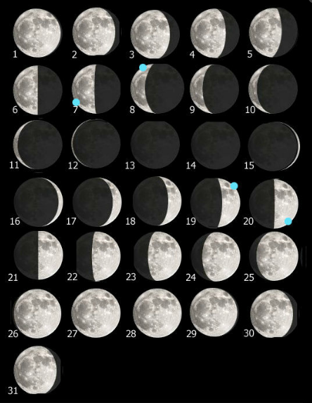 Nel procedere della Fase Calante la Luna sarà in Ultimo Quarto alle 09:51 del 6 luglio raggiungendo successivamente il Novilunio alle 04:48 del giorno 13. Da qui ripartirà un nuovo ciclo di Luna Crescente con la fase di Primo Quarto del 19 luglio alle 21:52 a un’altezza di +28° con transito in meridiano alle 19:13 a +39° fino al 27 luglio quando, dopo essere sorta alle 20:44, la Luna raggiungerà alle 22:20 la fase di Plenilunio a un’altezza di +12°30′. Infine luglio si concluderà col nostro satellite in Fase Calante.