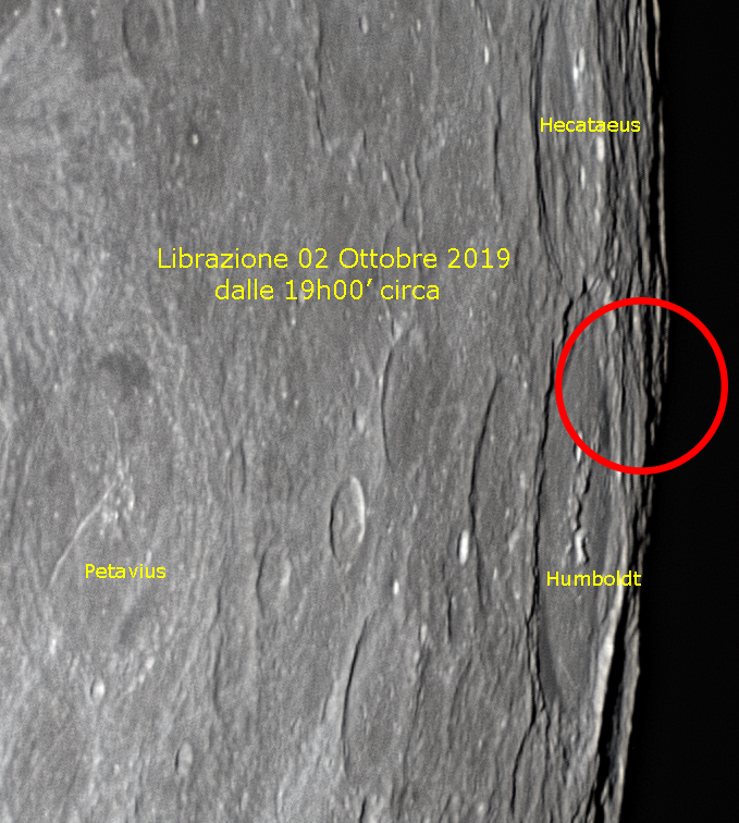La prima proposta in questo numero è per la serata del 2 ottobre quando, dalle 19:00 circa e fino al suo tramonto previsto per le 21:32, il punto di massima librazione si troverà alla latitudine di Humboldt, una grande e spettacolare struttura crateriforme di 213 km di diametro la cui origine risale al Periodo Geologico Imbriano Superiore (da 3,8 a 3,2 miliardi di anni fa). Per l’occasione il nostro satellite sarà in fase di 4 giorni, a un’altezza iniziale di +19°.