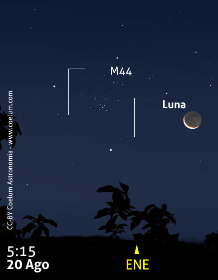 Una ripresa al limite, ma che potrà dare grande soddisfazione a chi riuscirà a portarla a termine. Il 20 mattina, una sottilissima falce di Luna calante (fase 3%) sorgerà attorno alle 4:40 anticipando il Sole di un paio d’ore. A soli 3° circa più a ovest, con lei sorgerà l’ammasso aperto M 44, chiamato l’Alveare o anche ammasso del Presepe.
