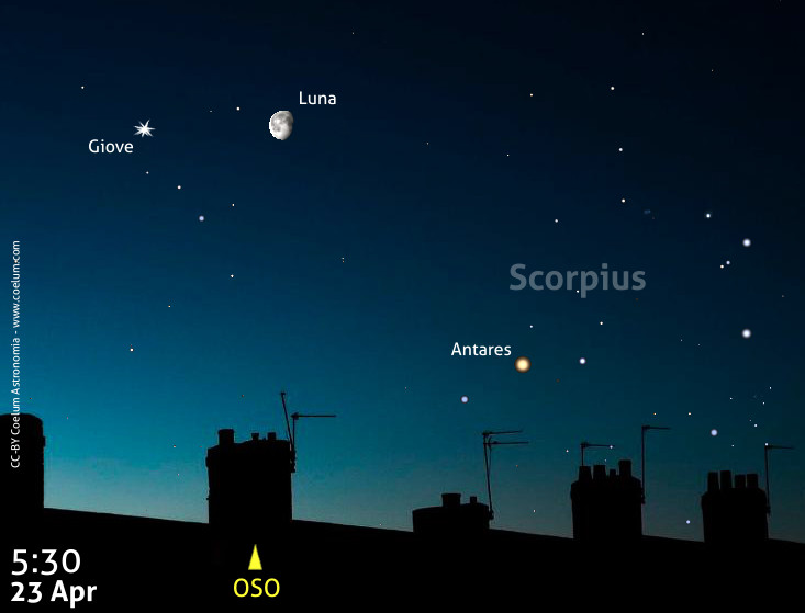 Il nostro satellite naturale si troverà a ovest rispetto a Giove e i due astri saranno alti circa 25° sull’orizzonte. Il quadro è completato dalla presenza a poca distanza della rossa stella Antares (mag. +1,05), stella alfa della costellazione dello Scorpione, la cui figura è facilmente riconoscibile più verso ovest.