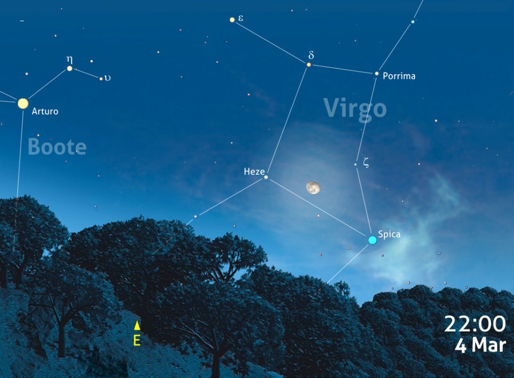 Il 4 marzo sarà ancora la Luna (fase 89,5%) la protagonista di un altro incontro con una stella. Questa volta tocca a Spica (mag. +0,1), la stella alfa della costellazione della Vergine. In realtà la Luna si troverà quasi equidistante tra le stelle Spica e Heze (Zeta Virginis, mag. +3,4), stella della medesima costellazione che però, a causa della sua ridotta luminosità, risulterà molto meno appariscente nella forte luce della Luna, rispetto alla bella Spica.