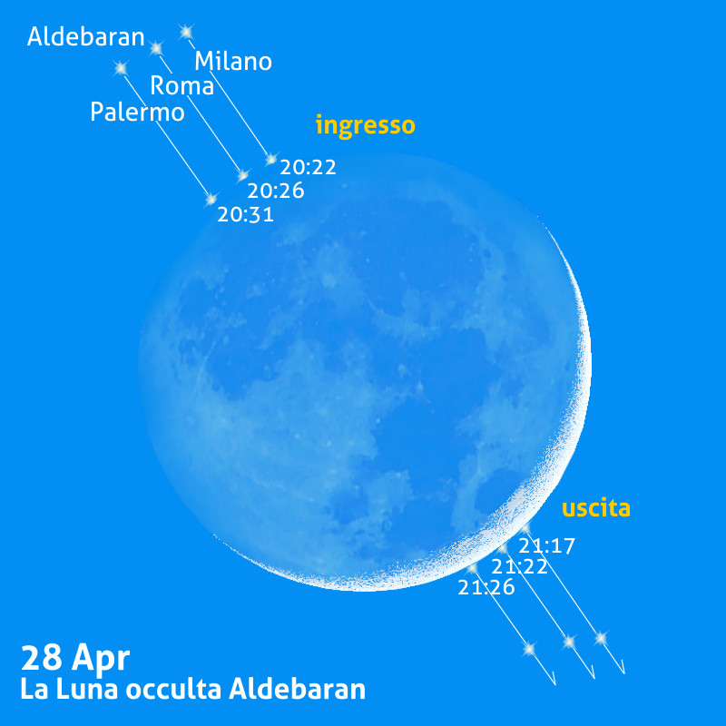 Più che nella scorsa occultazione del 5 febbraio scorso, sarà possibile vedere la brillante e arancione Aldebaran “spegnersi” sparendo dietro il disco oscurato della Luna, per poi riapparire dalla sottile falce frastagliata. L’unica difficoltà potrà essere la luce del crepuscolo al momento dell’ingresso.