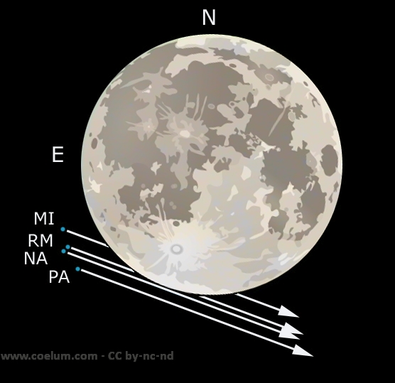 Il percorso apparente di Nettuno rispetto alla Luna calcolato per alcune località italiane. Nella figura la posizione iniziale di Nettuno è quella riscontrabile alle ore 21:00. A Roma, per esempio, Nettuno scomparirà dietro il bordo alle 21:16, per riapparire alle 21:38, a Milano scomparirà dalle 21:10 alle 21:48 e a Palermo alle 21:24 passerà 1,3' di distanza dal bordo meridionale. Crediti: Coelum Astronomia CC-BY-NC-ND