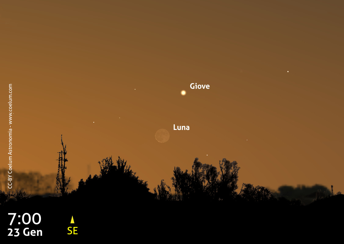 La mattina del 23 gennaio, alle ore 7:00 circa, una vera e propria sfida: guardando verso sudest noteremo, molto bassi sull’orizzonte, il pianeta Giove (mag. –1,9) e una sottilissima falce di Luna (fase del 2,7%), a circa 2° 30’ a sudest del pianeta.