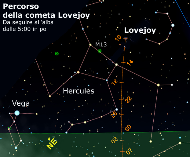 Dal 12 al 16 dicembre passerà 6° a sud dall’ammasso globulare M13, per poi abbassersi sempre più (il perielio è previsto per il 22 dicembre) e osservarla diventerà sempre più difficile.