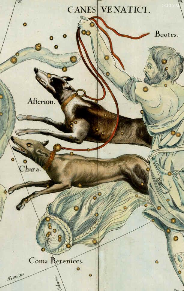Una delle prime rappresentazioni della costellazione dei Cani da Caccia per mano di Johannes Hevelius
