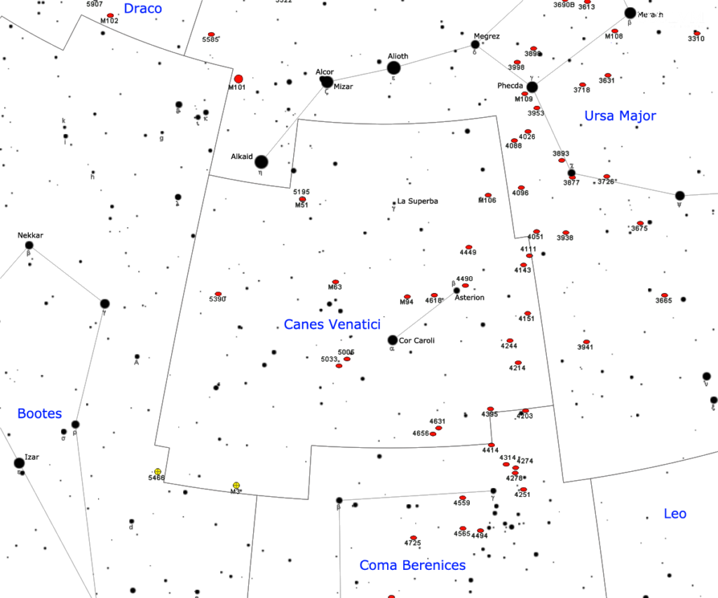 Quella dei Cani da Caccia (in latino Canes Venatici, con abbreviazione CVn), è una costellazione boreale quasi circumpolare per le nostre latitudini, situata immediatamente al di sopra della Chioma di Berenice e racchiusa tra il Boote e l’Orsa Maggiore.