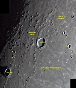 La terza proposta, prevista per il 25 e 26 giugno, sarà dedicata all’osservazione di una ristretta ma interessantissima porzione dell’enorme Oceanus Procellarum, la più estesa regione relativamente pianeggiante esistente sulla Luna con una superficie di 4 milioni di km quadrati che occupa gran parte del settore occidentale. Nel caso specifico andremo a visitare le Marius Hills (Le Colline di Marius) costituite da un insieme di rilievi vulcanici cupoliformi aventi mediamente un’altezza dai 180 ai 500 metri. La linea del terminatore lunare ci consentirà dettagliate osservazioni in alta risoluzione di una infinita quantità di dettagli.