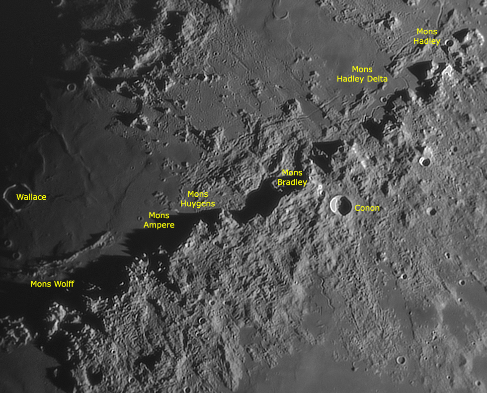 Iniziamo dall’estremità meridionale col cratere Eratosthenes di 60 km di diametro e pareti alte 3600 mt con pendii ripidi percorsi da lunghi terrazzamenti, mentre sul fondo del cratere è possibile individuare un sistema montuoso centrale multiplo e numerosi rilievi collinari. Scorrendo col telescopio lungo gli Appennini da Eratosthenes verso nordest, fra le principali vette la prima che si incontra è il Mons Wolff esteso per 36 km e con un’altezza di 3500 mt. Per facilitarne l’individuazione notare che questo rilievo montuoso viene a formare un angolo retto rispetto ai crateri Eratosthenes e Wallace.