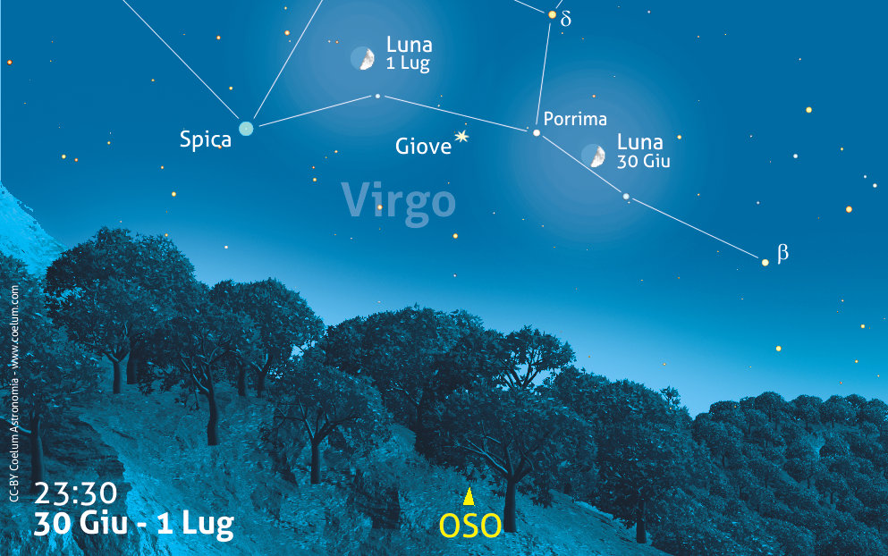 Il 30 giugno, chiude il mese il quartetto che l’ha iniziato… configurazione diversa ma stessi attori. La Luna quasi al Primo Quarto infatti passerà a 6,7° ovest di Giove (mag. –2,1) e a 3,1° a sudovest di Porrima (gamma Virginis; mag. +2,8). Spica sempre presente a poco più di 10° a est del terzetto.