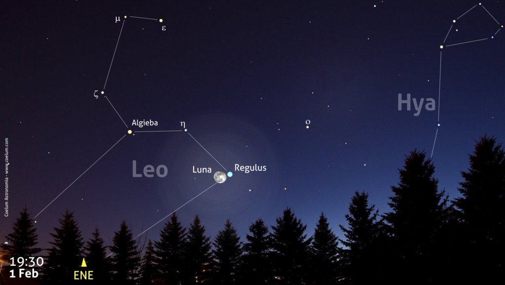 Iniziamo subito la prima sera del mese con una bella congiunzione stretta tra Luna praticamente Piena (fase 98%) e vicina al Perigeo, e la brillante Regolo (mag. +1,4) stella alfa del Leone.