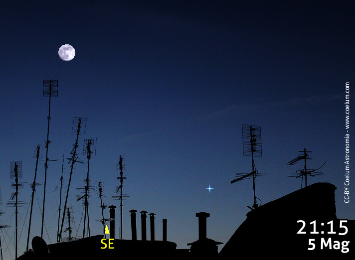 La sera del 5 maggio, alle ore 21:15 circa, volgendo il nostro sguardo verso sudest, potremo notare, ad un’altezza di circa 25°, la Luna (fase del 96%) in congiunzione, piuttosto ampia, con Spica, la stella Alfa della costellazione delle Vergine (mag. +1). La separazione sarà di 6° 20’ con la Luna a nord-nordovest della stella.
