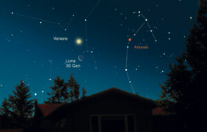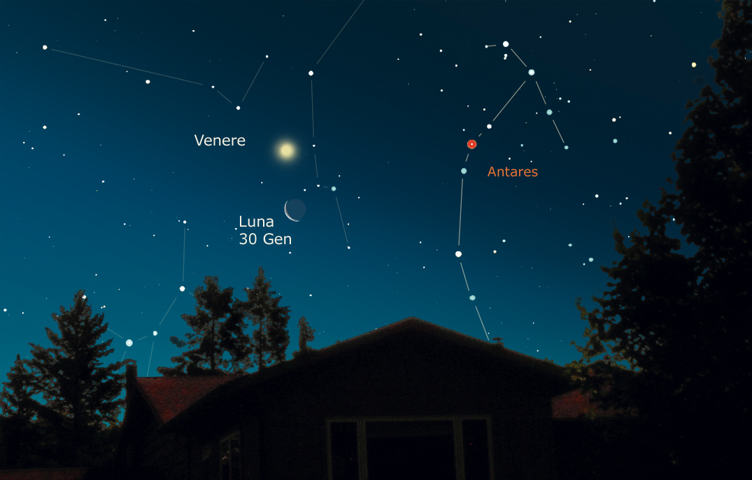 All’alba del 30 gennaio una sottile falce di Luna calante (fase 14%) sorge nello Scorpione 4,3 gradi a sud di Venere (mag. –4,4). Pochi gradi a est è visibile anche la rossa Antares (alfa Scorpii; mag. +1,0), all’incirca alla stessa altezza di Venere.