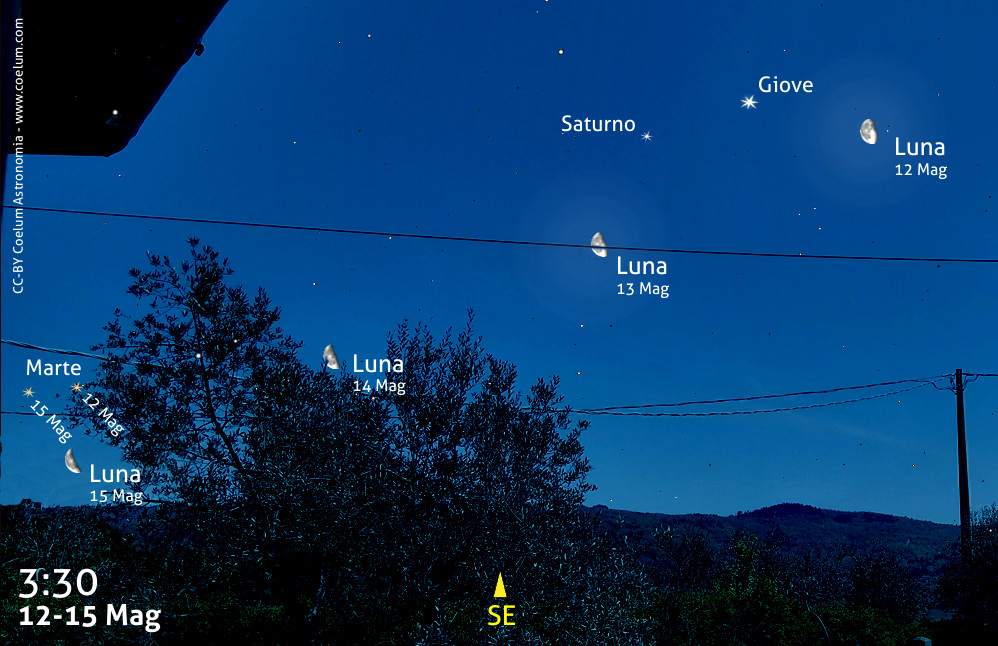 Si inizia il giorno 12 maggio, ore 3:30: guardando verso sudest, tra le stelle del Sagittario potremo riconoscere facilmente la Luna (fase del 75%) a circa 5° 20’ da una brillante “stella” color giallo paglierino, il pianeta Giove (mag. –2,4). 4° 40’ più verso est, una seconda “stella” brillante segna la posizione di Saturno (mag. +0,5).