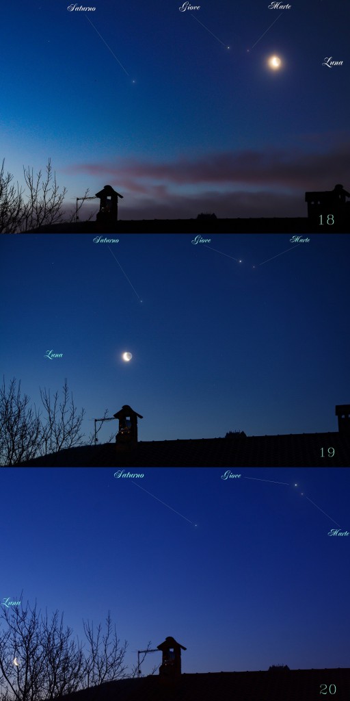 Questo trio, alto circa 18° sull’orizzonte, è il protagonista indiscusso di questa congiunzione, ma, guardando più verso est e più in basso, noteremo anche la presenza di un più debole astro, dallo spiccato color arancione: è Marte, che completa il quadro.