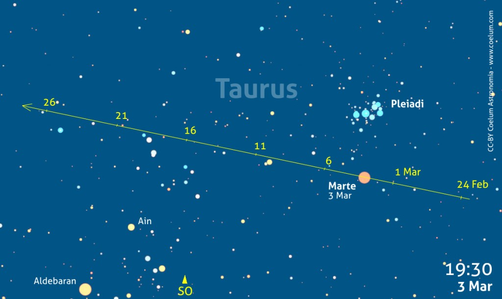 La sera del 3 marzo, alle ore 19:30 circa, guardando verso sudovest, a circa 55° di altezza sull’orizzonte, potremo riconoscere facilmente la regione celeste dominata dalla costellazione del Toro.