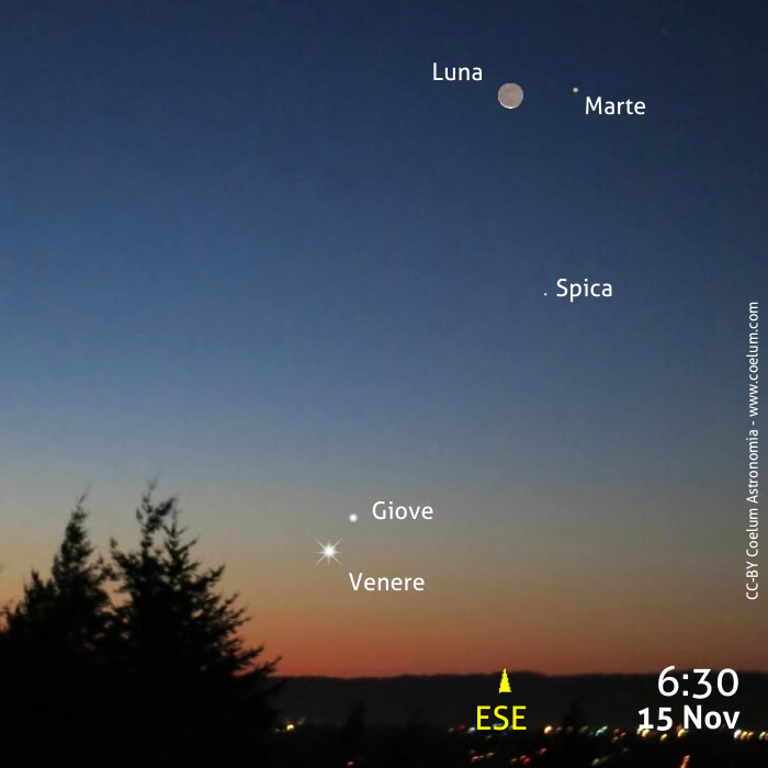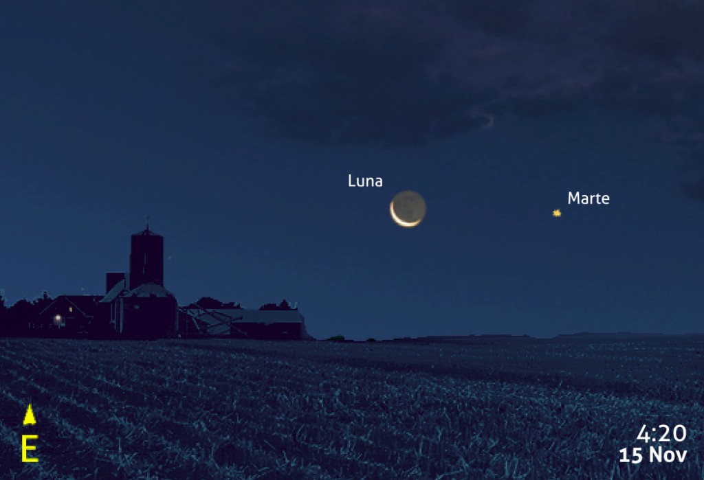 Alle 4:00 del 15 novembre, una sottilissima falce di Luna (fase del 10%) sorgerà a soli 2,8° a est di Marte (mag. +1,8), converrà attendere però l’ora indicata nella cartina sopra per poterli avere sopra i 10° sull’orizzonte Est. I due astri potranno poi essere seguiti ancora per poco meno di un paio d’ore, sempre più alti nel cielo del mattino, prima che l’alba la faccia da padrona.