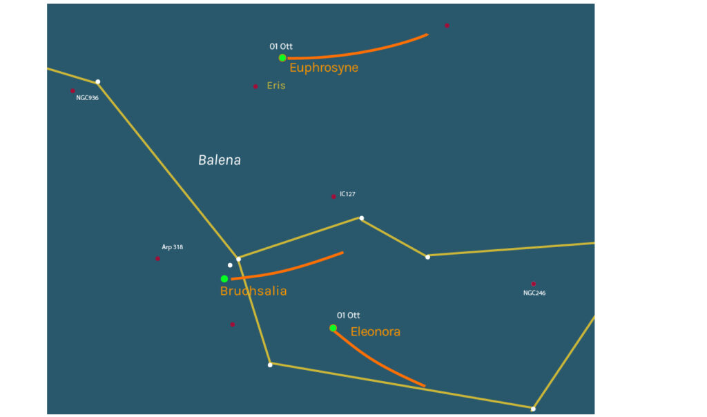 Scoperto da Auguste Charlois il 17 Gennaio 1893, questo imponente asteroide (all’incirca 154 chilometri di diametro) sarà in opposizione il 6 Ottobre. In questo frangente raggiungerà la massima brillantezza con una magnitudine di 10.9. Il suo moto sarà di 0,57 secondi d’arco al minuto, quindi, per far si che l’oggetto mantenga un aspetto puntiforme nelle nostre immagini potremo utilizzare tempi di esposizione fino a 5/6 minuti. Per ottenere una traccia di movimento dovremo esporre (o integrare) per un tempo più lungo, e con 40 minuti di posa vedremo (354) Eleonora trasformarsi in una bella striscia luminosa di 22,8 secondi d’arco.