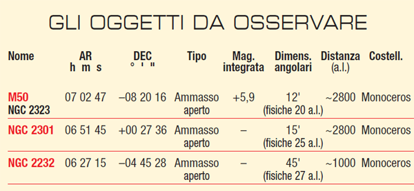 M50, un ammasso a forma di cuore? – Nella parte meridionale della costellazione, quasi al confine con il Cane Maggiore e 2,5° a nordovest della famosa “Seagull Nebula” (IC 2177), si trova un oggetto deep-sky decisamente appariscente. Stiamo parlando di M50, un ammasso aperto esteso per circa 15 primi d’arco e popolato da un centinaio di stelle che brillano di una luminosità compresa tra la mag. +9 e +13; il che lo porta a una magnitudine apparente integrata di +5,9 e quindi alle soglie della visibilità ad occhio nudo, tanto che non pochi osservatori assicurano di essere riusciti a vederlo sotto
