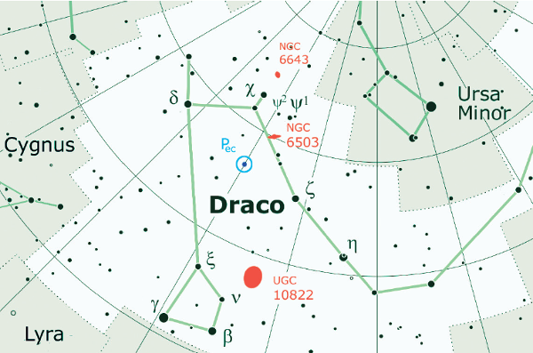 Ben alta sulle nostre teste in questo periodo dell’anno, la costellazione del Draco si snoda attorno al Polo nord celeste, insinuandosi tra le due Orse e protendendo la testa verso l’Ercole, l’eroe greco da cui, secondo la mitologia greca, l’animale verrà ucciso. Lunghissima (la sesta più grande costellazione per estensione), circumpolare (e dunque sempre al di sopra dell’orizzonte), per l’osservatore visuale questa zona di cielo offre numerose attrattive, come ad esempio quella di ospitare il Polo nord dell’Eclittica, situato proprio nei pressi della testa della mitica creatura. Ed è proprio in quei dintorni che andremo alla ricerca di tre galassie misconosciute.
