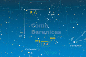 La cartina è centrata sulla piccola costellazione della Chioma di Berenice, la cui caratteristica principale è quella di ospitare il Polo Nord Galattico (il cerchietto giallo) e di essere popolata da grandi ammassi di galassie. Il suo nome, legato a quello di una antica regina egiziana, prende spunto dalla presenza (nei pressi della stella gamma) di un ammasso di stelle molto debole e disperso, che nella notte richiama il fluire di una chioma femminile. La costellazione contiene 7 oggetti del catalogo Messier, e