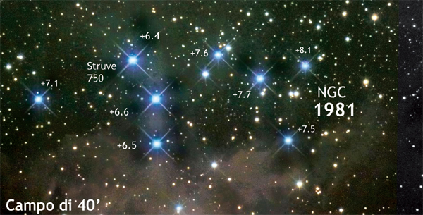 si tratta infatti di un ammasso di notevoli dimensioni angolari (grande quasi come il disco lunare) e di forte luminosità apparente (mag. +4,2). Stiamo parlando di NGC 1981, un gruppo di stelle visibile anche ad occhio nudo nelle notti più scure; le sue componenti più luminose sono infatti una decine di giovani (5 milioni di anni) stelle azzurre di magnitudine compresa fra la +6 e la +8. Malgrado la sua evidenza (è sufficiente un binocolo 10×50 per risolverlo completamente in nottate limpide), questo ammasso fu individuato soltanto il 4 gennaio 1827 da John Herschel, che lo descrisse al tempo come: “Molto brillante,