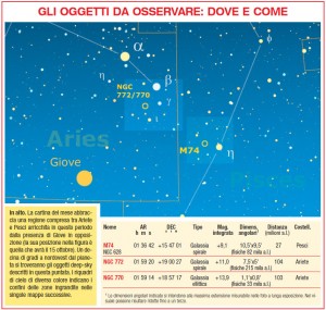 E così abbiamo fatto, scegliendo per la rubrica di questo mese tre galassie distanti appena una decina di gradi dal gigante gassoso: M74, NGC 772 e NGC 770.