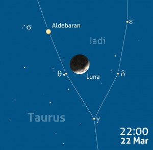 Il 22 marzo, dalle ore 22:00, sarà possibile ammirare una falce di Luna (fase del 30%) incorniciata dalle stelle del meraviglioso ammasso delle Iadi, nella costellazione del Toro. A poca distanza (circa 1° 40’) potremo vedere splendere la bella Aldebaran (mag. +0,9), la stella alfa del Toro.