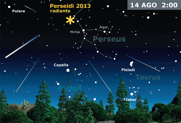 La figura mostra la posizione del radiante delle Perseidi come apparirà verso le 2:00 del mattino del 14 agosto. A quell’ora la costellazione sarà alta circa +40° sull’orizzonte di nordest e la Luna sarà ancora sotto l’orizzonte. Sebbene il picco massimo di attività sia previsto per la sera precedente, riteniamo che sarà questo l’orario più adatto per gli osservatori del nostro paese, ma pure indicata sarà la notte del 12/13, sempre tenendo a mente che lo sciame sarà comunque attivo per un periodo molto più lungo; e che nei giorni a cavallo del massimo sarà sempre possibile la caduta di grandi bolidi isolati.